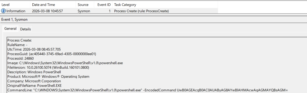 Sysmon Event ID 1 capturing the execution of PowerShell with the -EncodedCommand argument.