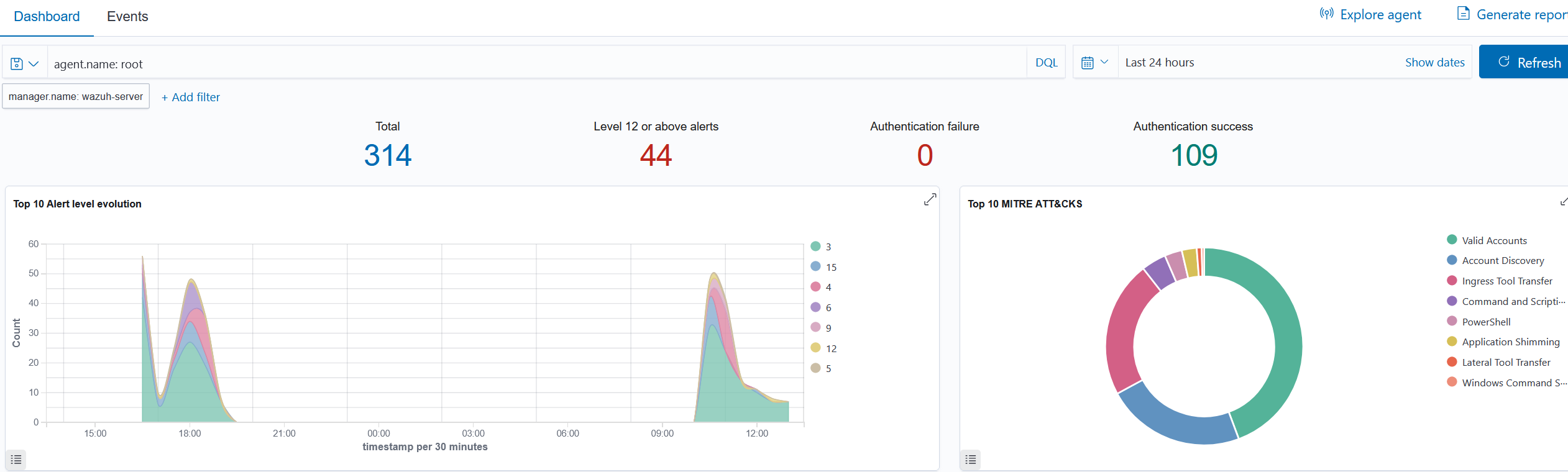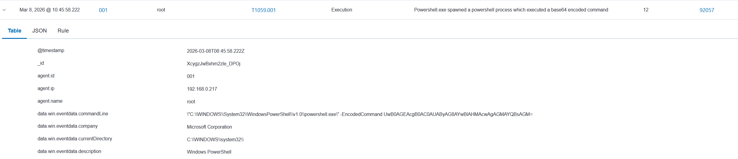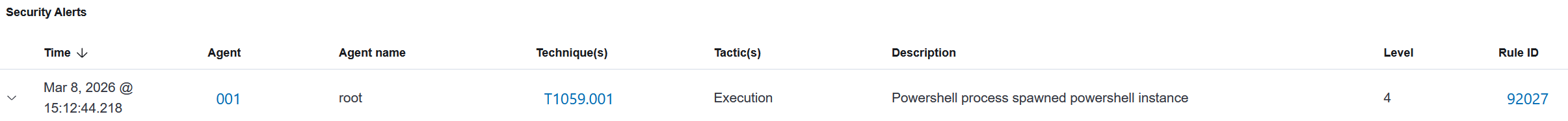 Wazuh successfully ingested the telemetry, demonstrating endpoint visibility even when a dedicated alert rule was not triggered.