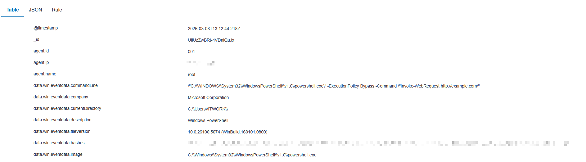 Wazuh rules analyze process creation events and command-line arguments to identify suspicious PowerShell activity.