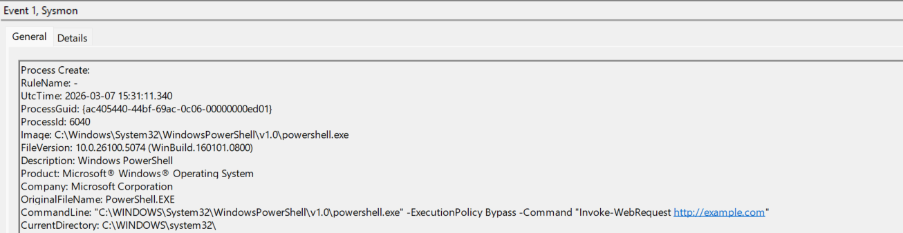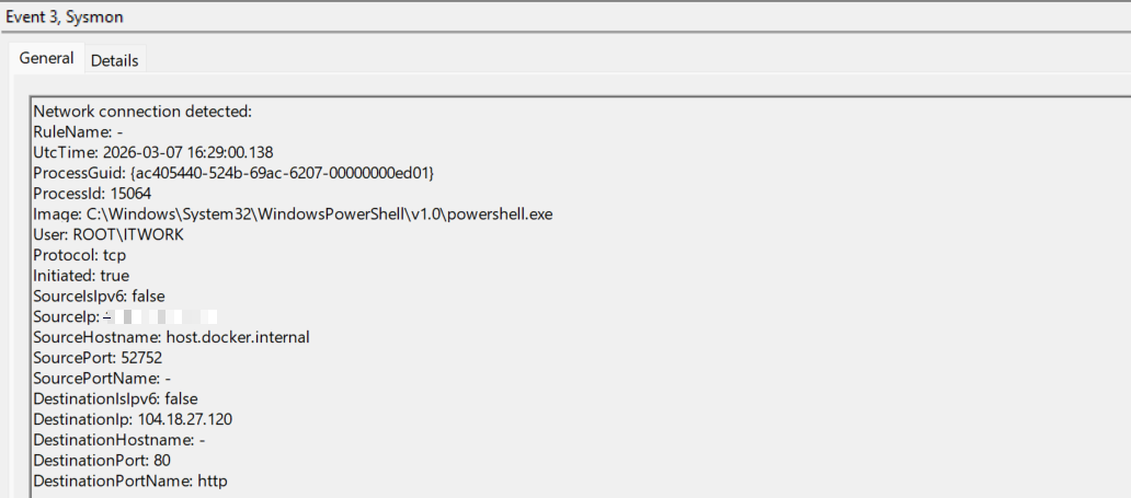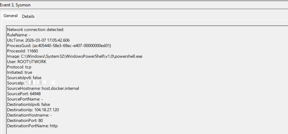 Sysmon captured outbound HTTP activity initiated by PowerShell.